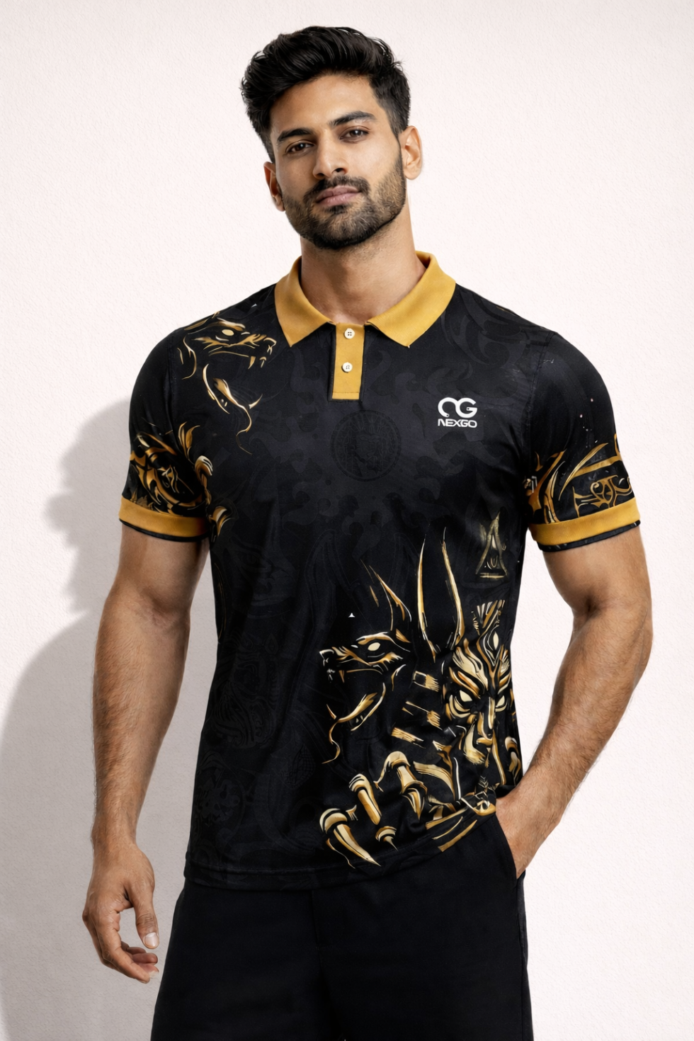 The Nexgo Premium Printed Polo T-Shirt is crafted for those who want to make a bold statement without compromising on comfort. Featuring an elegant black base with striking gold artwork and a classic polo collar, this T-shirt blends sporty performance with a premium, lifestyle look.